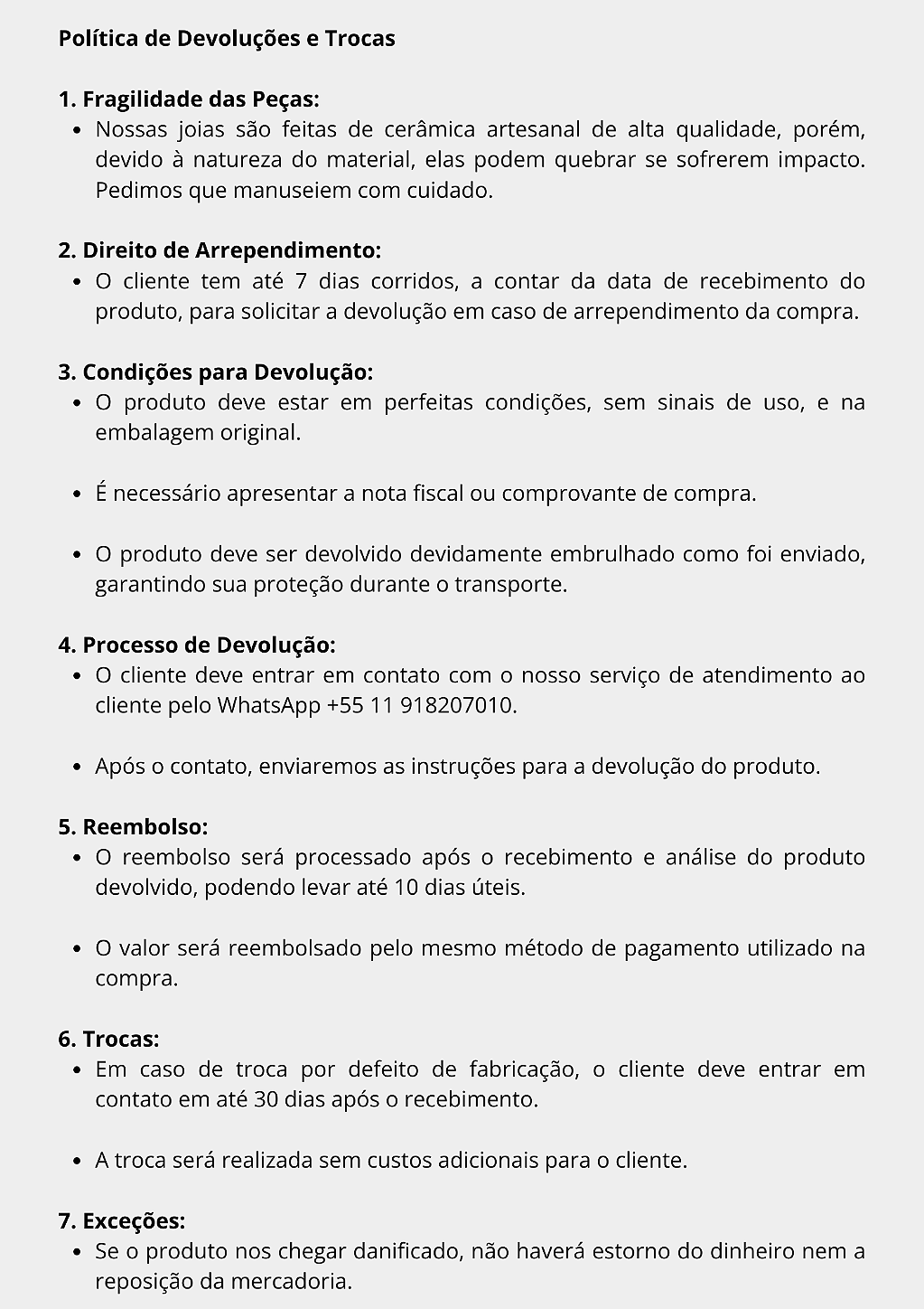 Débora Amaral é uma artista visual brasileira cujas criações evocam a ancestralidade, a biodiversidade e a poesia das artes do fogo. A joalheria, um gesto poético herdado do ofício paterno, é a expressão de sua herança artística. Após descobrir a arte da cerâmica, imergiu no universo da escultura e retornou ao processo artesanal que a acompanhava desde a infância. Nossas joias em cerâmica são feitas com materiais não tóxicos e estão livres de chumbo, níquel e chumbo.