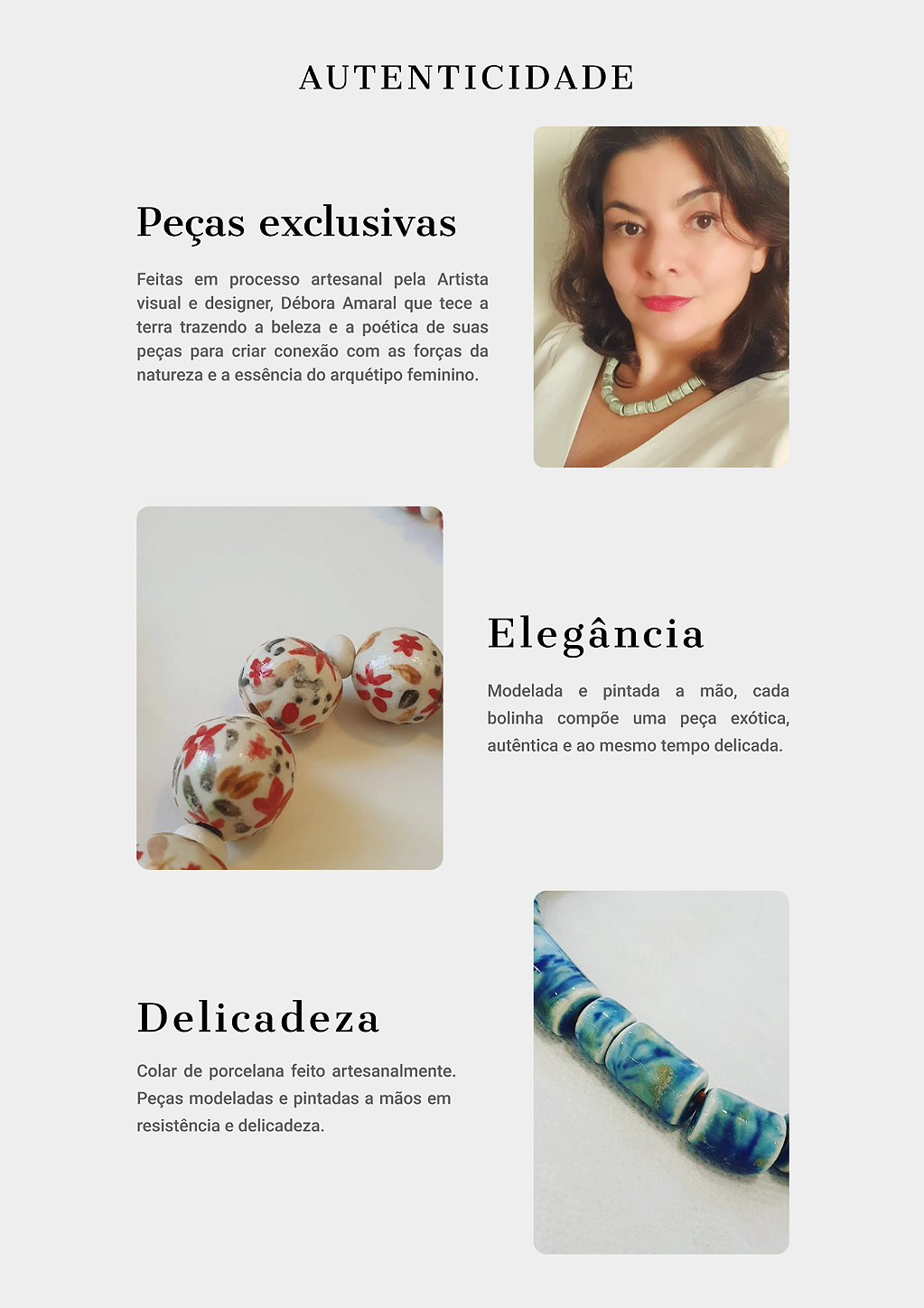 Débora Amaral é uma artista visual brasileira cujas criações evocam a ancestralidade, a biodiversidade e a poesia das artes do fogo. A joalheria, um gesto poético herdado do ofício paterno, é a expressão de sua herança artística. Após descobrir a arte da cerâmica, imergiu no universo da escultura e retornou ao processo artesanal que a acompanhava desde a infância. Nossas joias em cerâmica são feitas com materiais não tóxicos e estão livres de chumbo, níquel e chumbo.